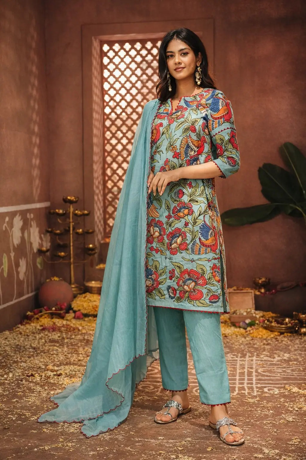 Elegant Cotton Kalamkari Beige with Multicolor Design Kurta Set with Dupatta
