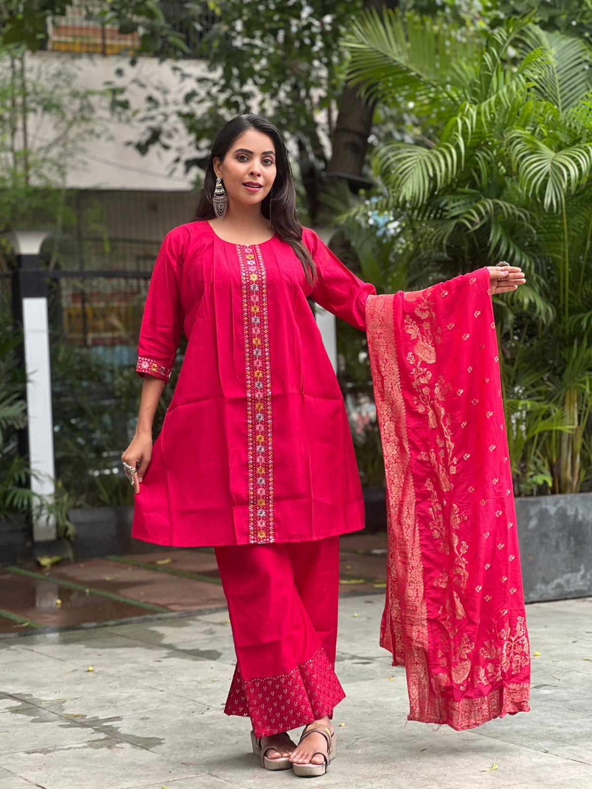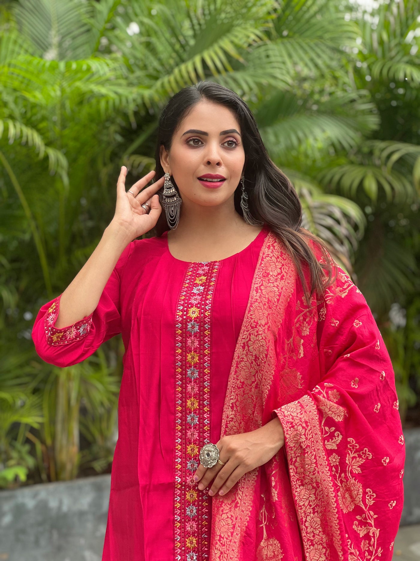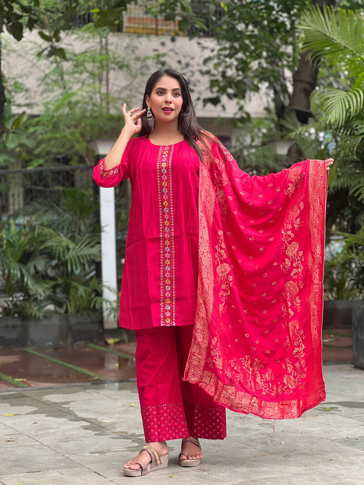 SKU : VRKSKBD01R Kurti Fabric : Roman silk Kurti Color : Rani Type : Traditional Bottom Color : Rani Bottom Fabric : Roman Silk Dupatta : Muslin Jaquard Wash And Care : Hand Wash only. Do not dry in direct sunlight Size And Fit : The model height is 5.7 ft Weight : Approx. 0.550 Kg